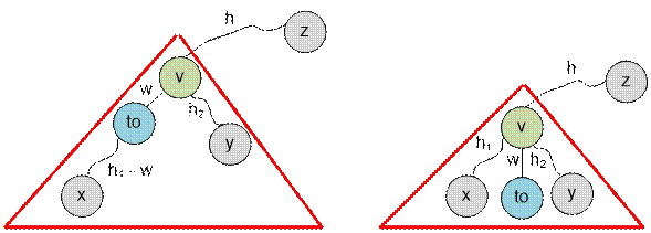 вершины v, лежащий на пути длины h1 из v в самый дальний лист (картинка слева). Тогда при входе в to самым длинным расстоянием от to до вершины вне поддерева с корнем в to будет max(h, h2) + w, где w = g[v][to]. Поэтому состоится рекурсивный вызов