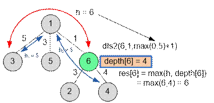 глубину было вычислено depth[6] = 4. Следовательно res[6] = max(h, depth[6]) = max(6, 4) = 6.