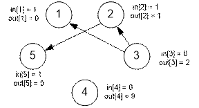 3 и 4 являются истоками, так как в них не входит ни одного ребра (in[3] = 0 и in[4] = 0).