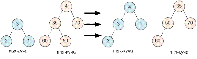 более чем на один элемент превышает размер max-кучи, то наименьший элемент min-кучи переносим