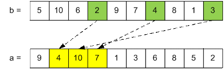 4, 10, 7 – индексы ячеек массива а, в которых находятся числа 2, 3, 4. Остается