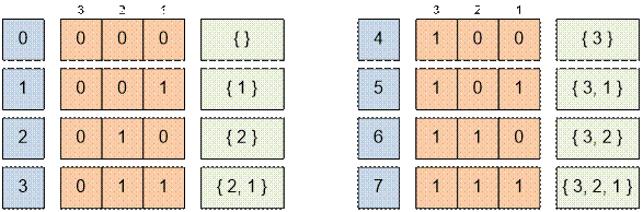 если n = 3 и i = 2, то двоичному представлению i = 0102 соответствует подмножество {2}.
