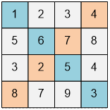 Сумма чисел на побочной диагонали равна 8 + 2 + 7 + 4 = 21.