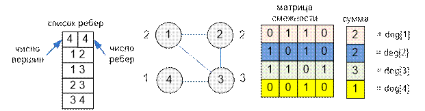 Для каждого ребра (a, b) увеличим степень вершин a и b (deg[a]++, deg[b]++).