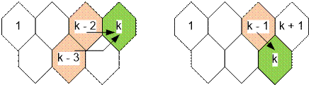 верхнем ряду (нечётный номер). Тогда пчела может попасть в неё либо из соты с номером k – 2, либо из соты с номером k – 3. Следовательно, для