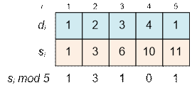 на котором встретилась частичная сумма d1 + … + di с остатком sum
