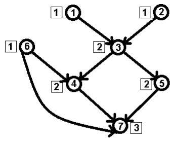 Для вершины 7 максимальный порядок Штралера равен 2, и он достигается на двух вершинах: 4 и 5. Следовательно order[7] = order[4] + 1 = 2 + 1 = 3.