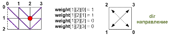 из точки (i, j) можно двигаться по направлению 0 и weight[i][j][0] = 0;