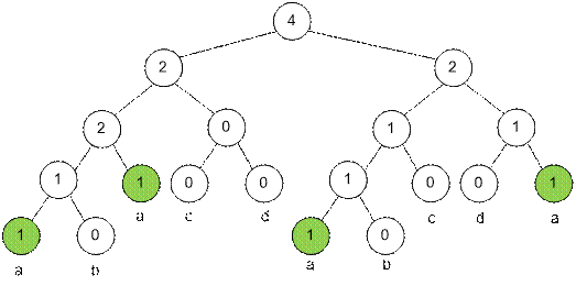 буквы ‘a’ и строки “abacdabcda” соответствующее дерево отрезков будет выглядеть так: