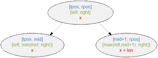 В левом подотрезке торговец будет продавать шапки в len = min(mid, right) – left + 1 городах, начиная с цены x. В правом подотрезке первая цена шапки в городе, куда придёт торговец, составит x + len. Таким образом, на отрезке с номерами [max(left, mid + 1), right] торговля начнётся с цены x + len. Однако если len < 0 (что возможно, если весь отрезок запроса находится в правом подотрезке), следует положить len = 0.