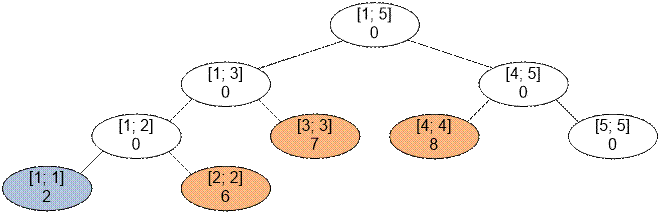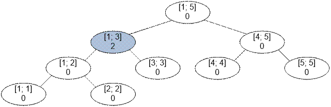 Например, пусть n = 5, и первая торговля охватывает города с номерами от 2 до 5, начиная с цены 4. Тогда отрезок [2; 5] распадется на фундаментальные: [2; 2], [3; 3], [4; 5]. После обработки первой операции дерево отрезков будет выглядеть следующим образом:
