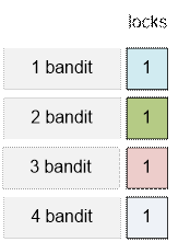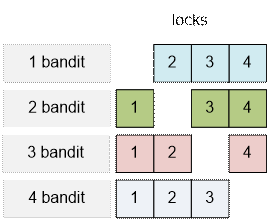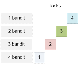 missing the key to exactly one lock. Any three bandits will be able to open all
