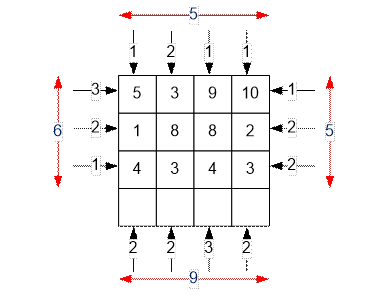 область. Игровое поле представляет собой прямоугольник размера r × c, заполненный числами. Закрытая область скрывает номер строки и