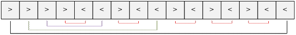 if (p.charAt(i) == '>') cnt++; else cnt--;
