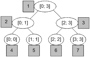 дерево отрезков для интервала [0; 3]. Возле каждой его вершины укажем индекс