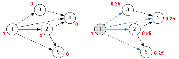 Промоделируем алгоритм Кана для графа, заданного в условии. Возле вершин графа приписана вероятность попадания в нее. Изначально (рисунок слева) вероятность нахождения во всех вершинах равна 0, кроме стартовой первой, вероятность пребывания в которой равна 1.