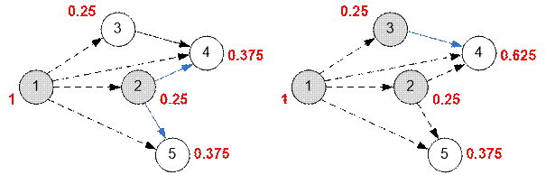 Далее вершина 2 будет занесена в топологический порядок. Из нее исходит два ребра. prob[2] / 2 = 0.125 следует прибавить к prob[4] и prob[5] (левый рисунок снизу). Следующей вершиной будет 3. Из нее исходит одно ребро. prob[3] / 1 = 0.25 прибавим к prob[4] (рисунок справа). Затем будут обработаны вершины 4 и 5, однако они не содержат исходящих ребер и вероятности пересчитываться не будут.