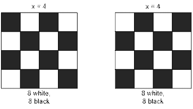 ·        (x2 – 1) / 2 black cells and (x2 + 1) / 2 white cells;
