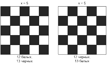 ·        (x2 – 1) / 2 white cells and (x2 + 1) / 2 black cells;