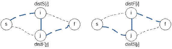 Запустим поиск в ширину из стартовой вершины s и финальной вершины f. Кратчайшие расстояния от s сохраним в массиве distS, а от f – в массиве distF.