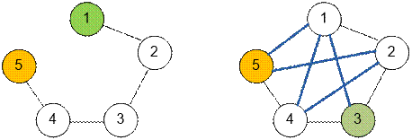Граф из первого теста приведен слева. Кратчайшее расстояние от вершины 1 до вершины 5 равно 4. Какую бы новую дорогу мы ни добавили, это расстояние уменьшится. Поэтому ни одной из требуемых дорог не существует.