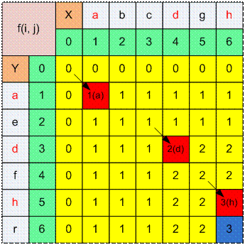 Наибольшей общей подпоследовательностью будет adh, ее длина равна f(6,