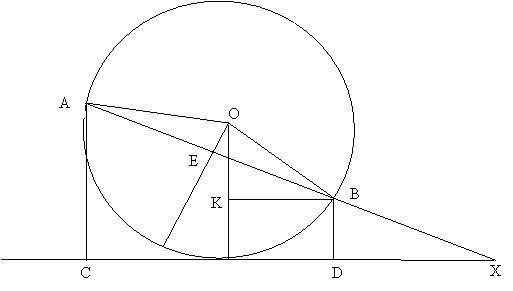В треугольнике OEB: OB = r, OE = rd, sin ÐEBO = (rd) / r. В треугольнике OKB: OB = r, OK = rh1, sin ÐKBO = (rh1) / r. Находим ÐKBA = ÐKBO – ÐEBO.  Из треугольника OEB: EB = , AB = 2 * EB. Из треугольника BDX: BX = BD / sin ÐDXB = h1 / sin  ÐKBA. Находим AX = AB + BX. Из треугольника ACX находим ответ: h2 = AC = AX * sin ÐDXB.