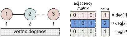 and there is an edge between vertices i and j, then m[i][j] = m[j][i] = 1). For each edge (i, j) we increment deg[i] by 1 (when the edge (j, i) is encountered, deg[j] will be incremented by 1).