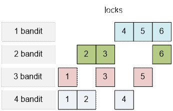 missing the key to exactly one lock. Any three bandits will be able to open all